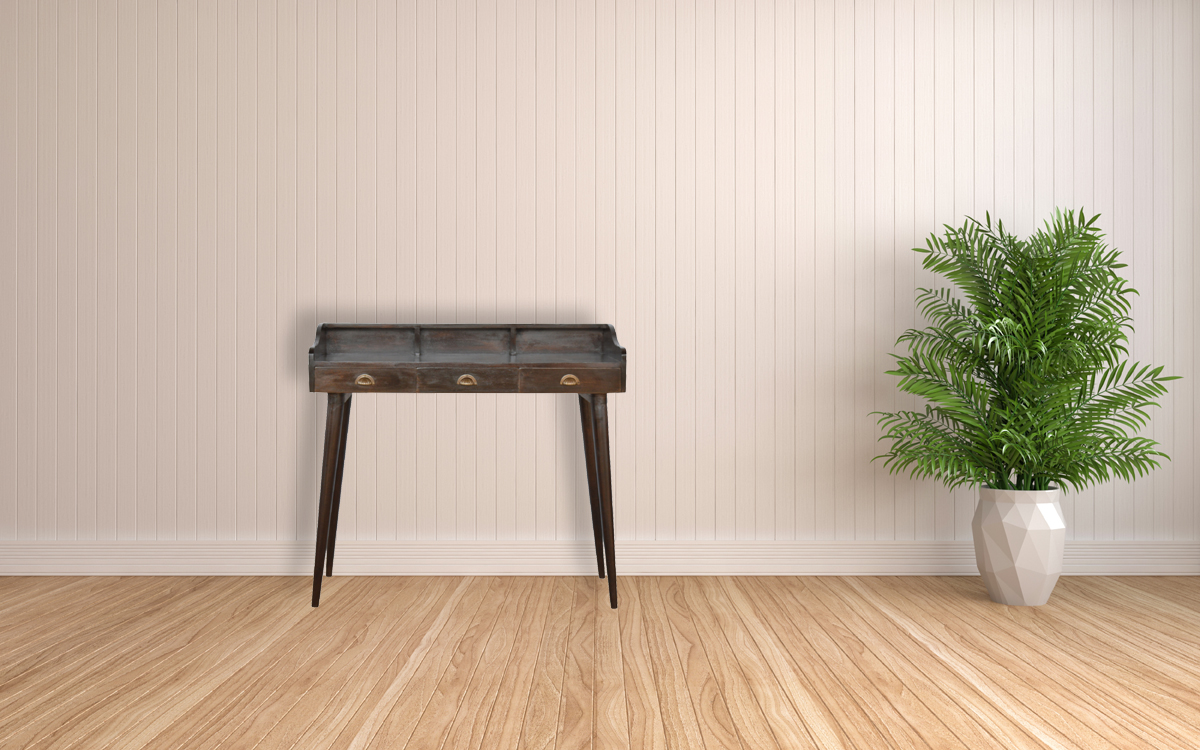 The Walnut Gallery Shell Writing Desk is a timeless, solid mango wood desk featuring a rich walnut finish, three spacious drawers, and a gallery back with built-in organizer slots. Handmade by skilled artisans with Nordic-style legs, this sustainable, fully assembled desk adds warmth, elegance, and practical storage to any home office or study.